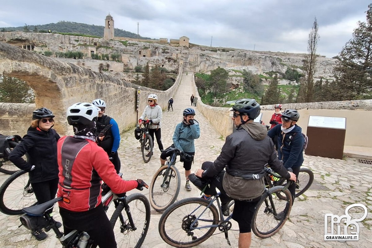 "Dal mare alla Murgia": questo il titolo scelto dagli organizzatori per la prima parte della giornata dedicata al cicloturismo. Il nome richiama l'asse che unisce Bari all'entroterra murgiano attraverso l'intermodalità tra treno e bicicletta. Al ritorno verso Gravina, lo stupore ha avvolto i ciclisti quando, sulla sinistra, è apparso il costone del torrente che poi hanno attraversato sul mitico "ponte di 007".