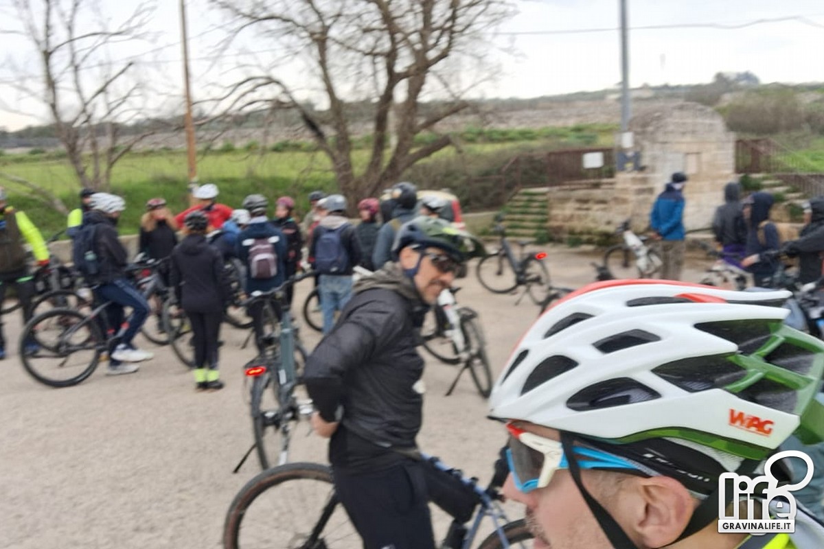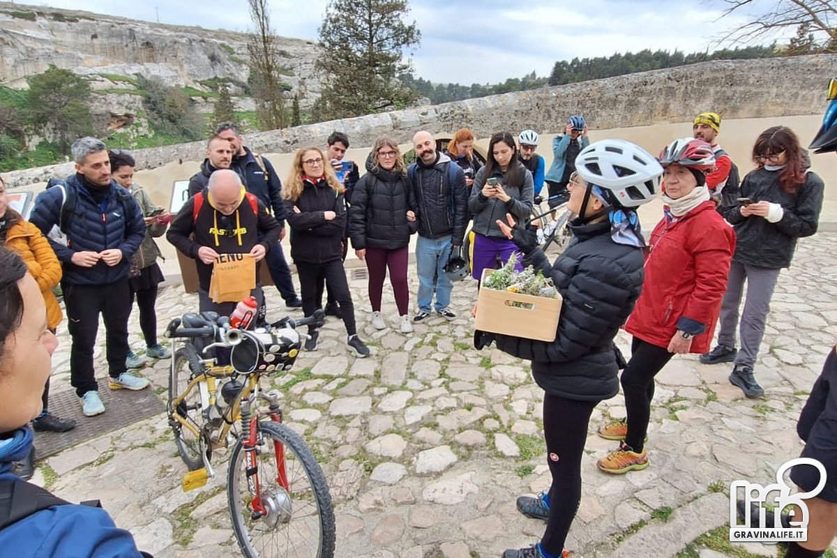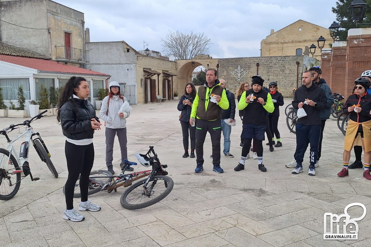 A guidare il gruppo sui sentieri murgiani è stato Ezio Spano (guida esperta AIGAE, gravinese doc). Insieme a Marghita, ha descritto il territorio del costone murgiano, soddisfacendo le numerose curiosità dei ciclisti, soprattutto davanti alle casette dell'"Ente Riforma".