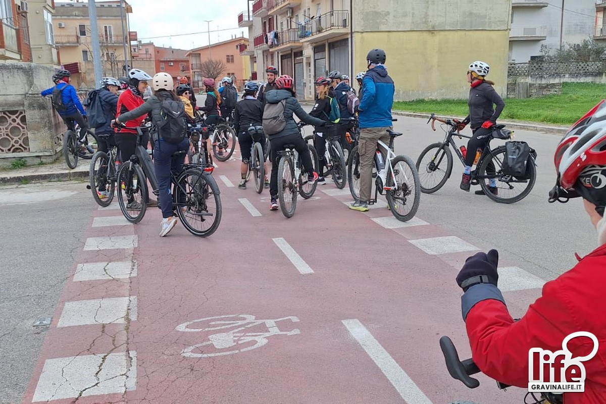 Partiti alle 10 dall'area fiera di Gravina, si sono diretti verso Poggiorsini lungo strade secondarie panoramiche e a bassa intensità di traffico. L'entusiasmo, lo stupore e la meraviglia di chi pedalava per la prima volta sulle strade murgiane hanno accompagnato l'intero tragitto, favorendo la socializzazione grazie all'andatura rilassata.