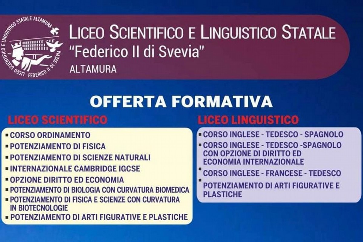 Una scuola per il territorio murgiano, con una ricca offerta formativa. Il Liceo Scientifico e Linguistico Statale "Federico II di Svevia" di Altamura ha alle spalle una lunga e solida tradizione e ha formato generazioni di professionisti in tutti i campi. Propone due indirizzi, il liceo scientifico ed il liceo linguistico. Entrambi offrono anche numerose possibilità di potenziamento in varie discipline, per venire incontro alle inclinazioni di tutti gli studenti e coltivare i talenti che sono in ciascuno di noi.