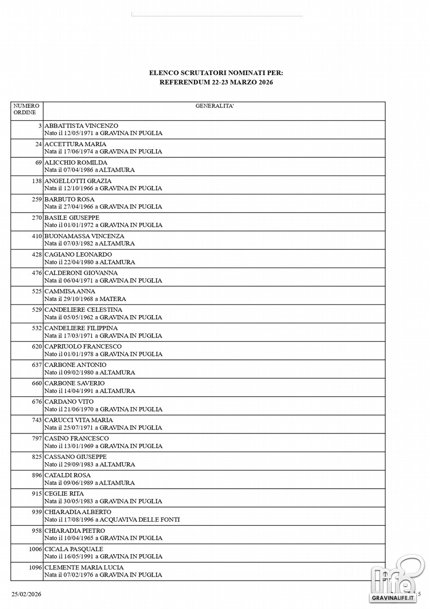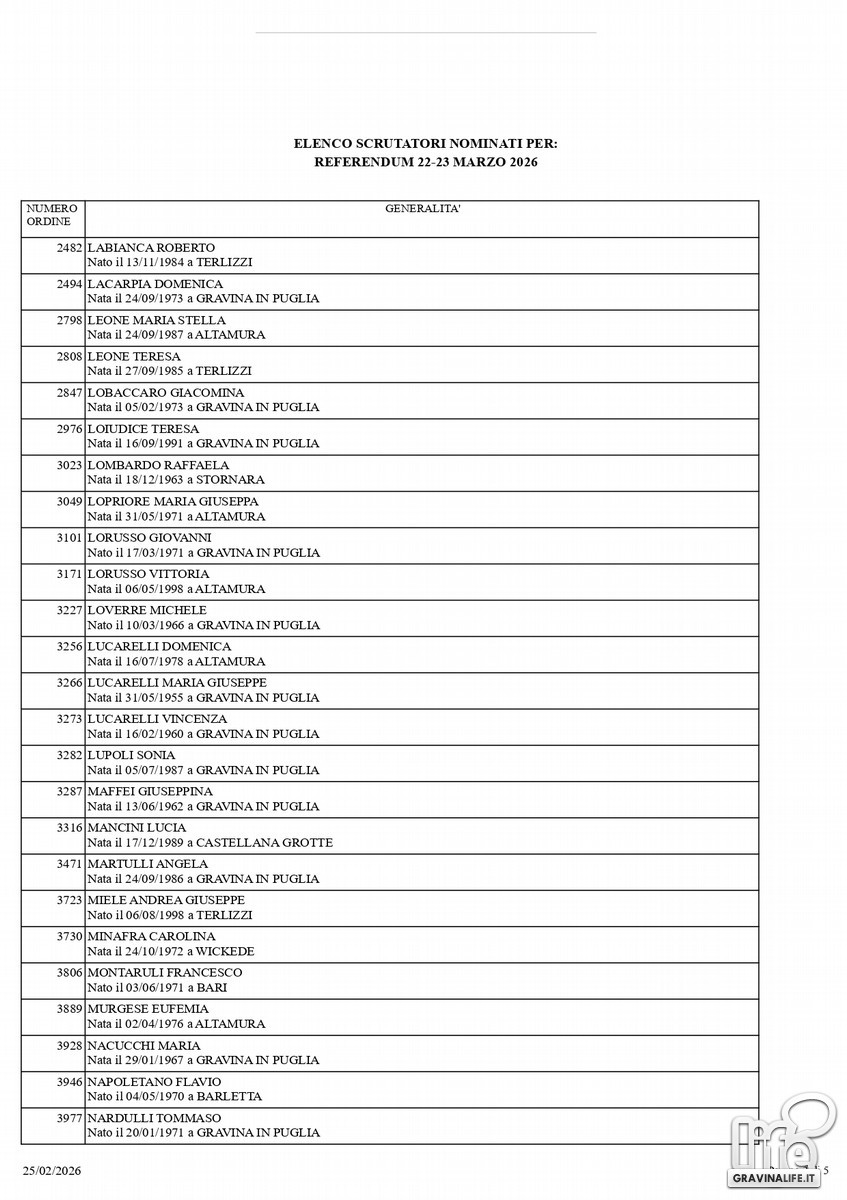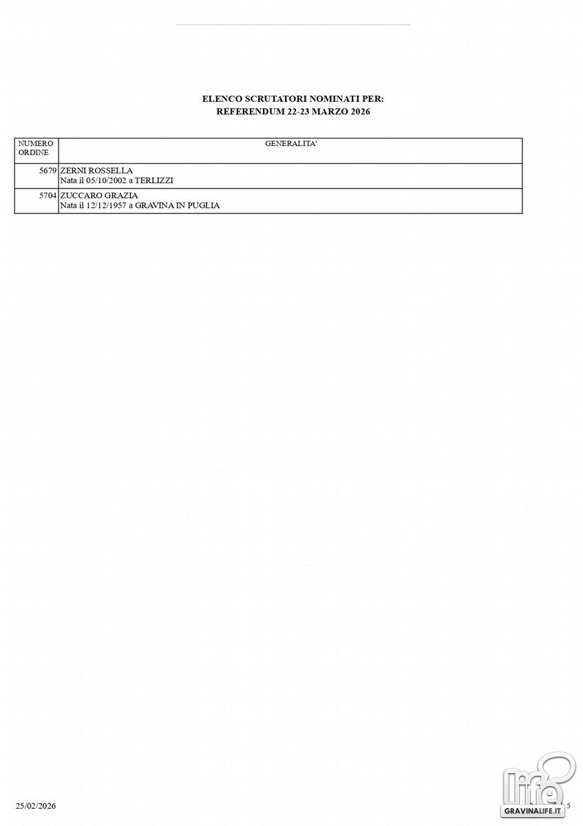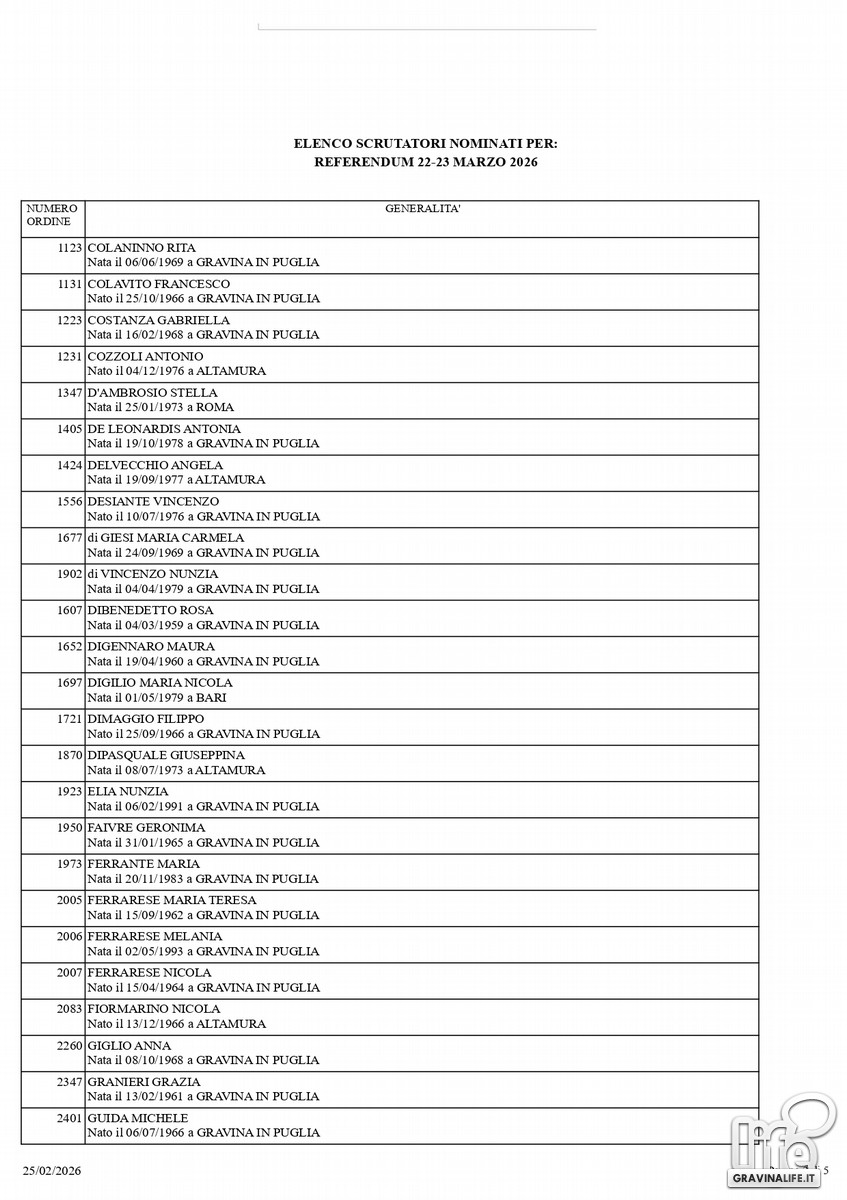 Dal sorteggio eseguito lo scorso 25 febbraio sono stati nominate 102 persone che saranno chiamate alla gestione della consultazione referendaria, in programma il 22 e il 23 marzo prossimo, quando gli elettori saranno chiamati alle urne per votare il referendum costituzionale che riguarda la separazione delle carriere tra Giudici e Magistrati.