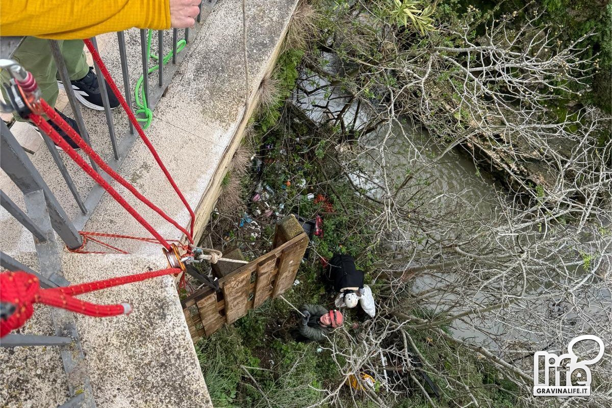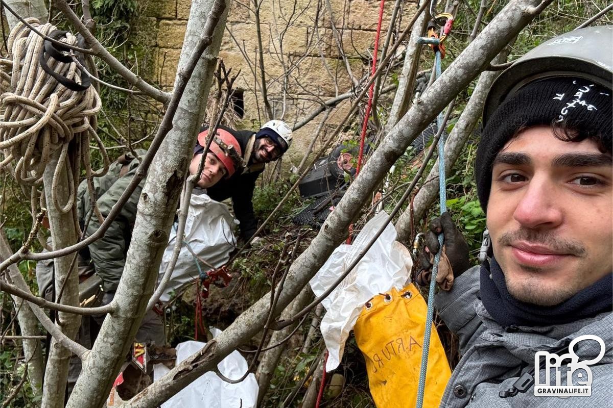 Il gruppo di volontari composto da Carlo, Claudio, Artur e Mino, si si era recato sul belvedere prospicente la gravina nel rione Fondovico armati di corde, guanti, buste, carrucole e soprattutto di buona volontà per effettuare un lavoro di pulizia straordinaria della gravina.