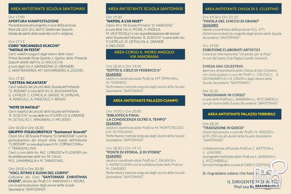 E così, oltre ai tradizionali canti natalizi e alle rappresentazioni teatrali che richiamano la natività, ci si potrà imbattere nei Gioghi della Tradizione; o in esibizioni folcloriche; oppure si potranno visionare gli elaborati artistici del concorso "Un poster per la Pace", o ancora ammirare le opere d'arte eseguite dai Madonnari in Corso e si potrà anche svolgere una visita guidata alla cappella di San Celestino, famosa per ospitare la statua del santo protettore della città di Gravina, San Michele Arcangelo, portata in processione nei giorni della festa dedicata al Patrono.